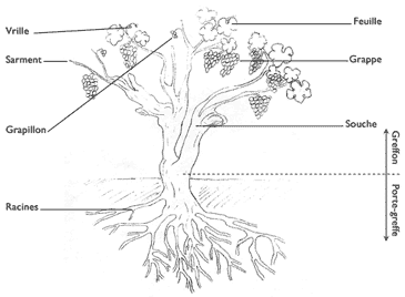 Les variétés américaines, très résistantes au phylloxéra, sont utilisées comme porte-greffe et les variétés européennes comme greffon.